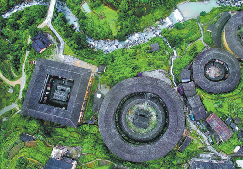 A bird's-eye view of world heritage tulou (earthen buildings) in Chuxi village, Longyan city. CHEN JUN/FOR CHINA DAILY
