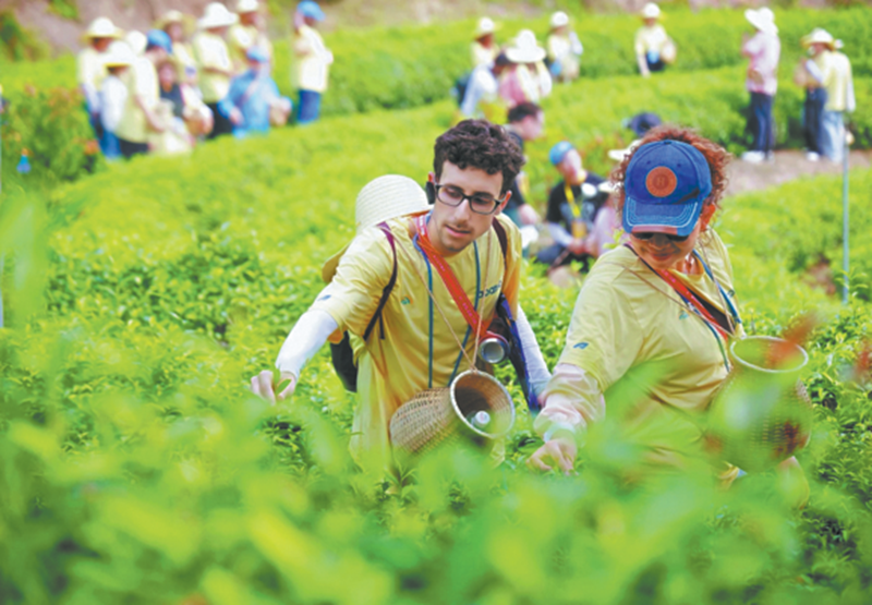 Foreign contestants of the Chinese Bridge competition pick tea on Wuyi Mountain. CHINA DAILY