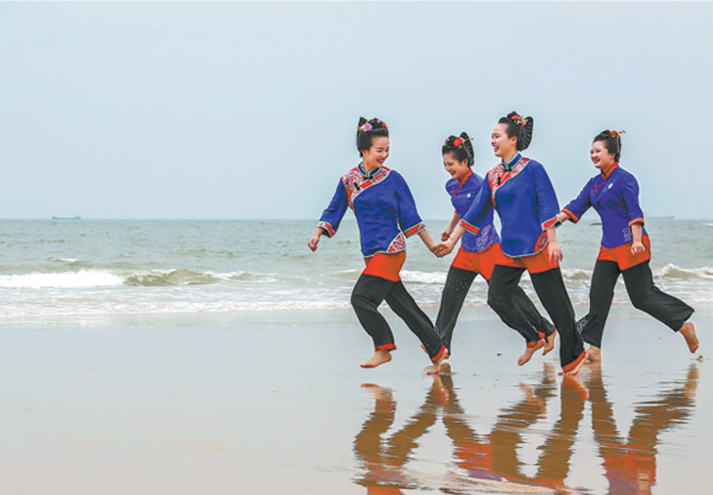 Women from fishing villages on Meizhou Island have fun on the beach. LIN CHUNSHENG/FOR CHINA DAILY