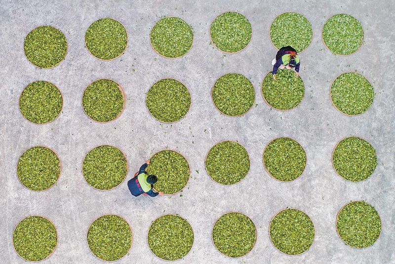 Farmers spread freshly picked tea leaves out in the sun to wither. [Photo provided to chinadaily.com.cn]