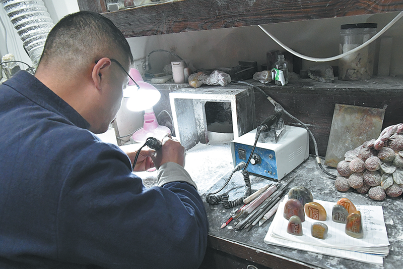 Sun Zhaoyong creates stone carving artwork with Shoushan stone at this studio in Fuzhou, Fujian province, in January. YE CHENG/FOR CHINA DAILY