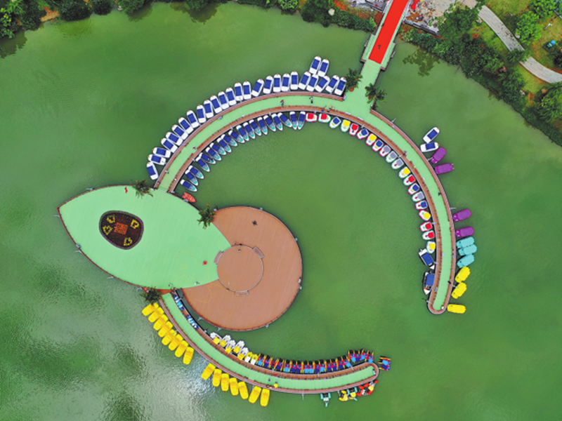 An aerial view of the tourist ferry dock in Jin'an Lake in Fuzhou. CHINA DAILY