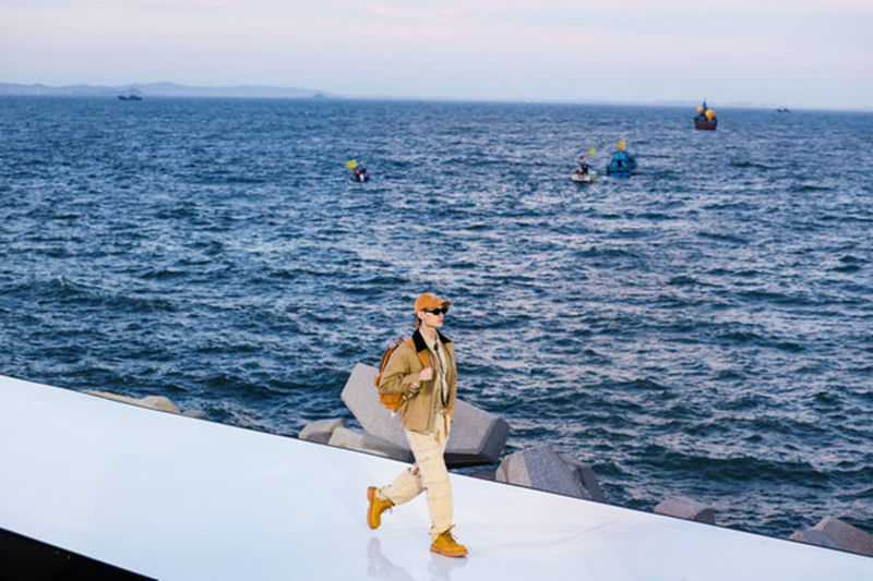 Transforming the sea into its stage and the sky into its backdrop, the show turned the harbor into a dramatic runway. A 150-meter catwalk extended into the water, with models appearing as if emerging from the ocean itself. Set against a backdrop of fishing boats, red-brick houses, and a distant lighthouse, the presentation seamlessly fused fashion with the spirit of the locale.