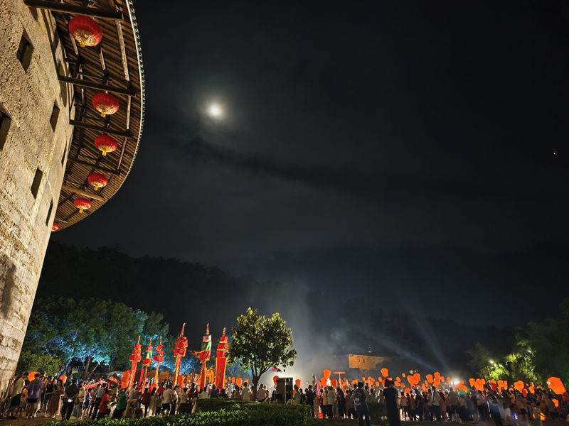 The Yongding Tulou Scenic Area is bustling with visitors at night. CHINA DAILY