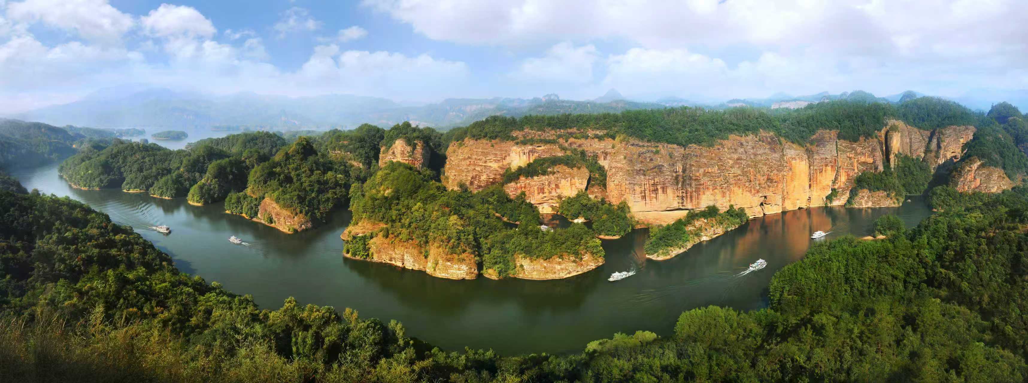 The Great Golden Lake is the core scenic area of Taining. Amidst its Danxia mountains and lucid waters, majesty and serenity are found in abundance. For miles, red cliffs intertwine with lake water, forming a globally rare landscape. Reputed as a picture-perfect fusion of lake and mountain vistas, it was praised by the renowned Chinese geologist Zhao Xun, who said, “Among the