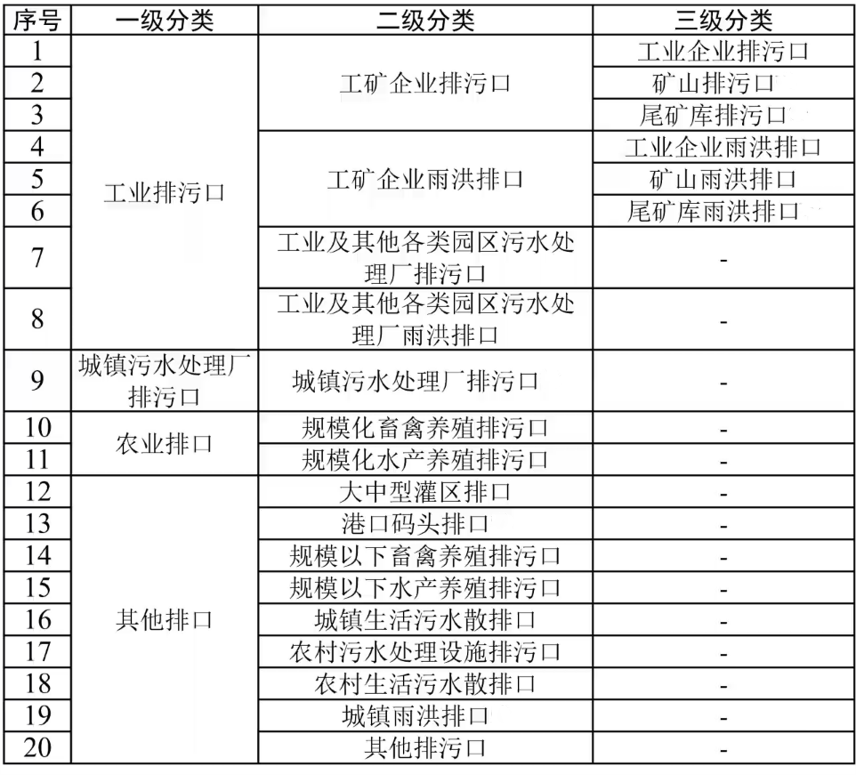 根据《入河入海排污口监督管理技术指南 排污口分类》(HJ 1312—2023),入河入海排污口分为工业排污口、城镇污水处理厂排污口、农业排口、其他排口四大类。详见表1。