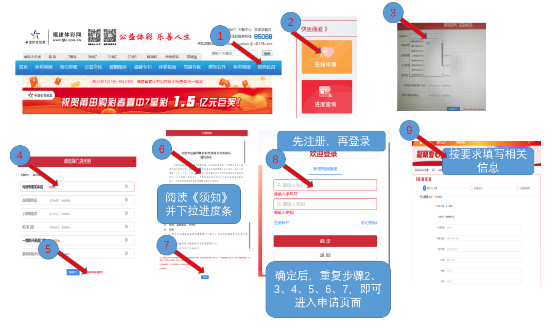 目前福建省体育彩票实体店的邀约工作已全面实现线上化操作。从实地勘察、材料提交到流程审批,所有环节均通过线上平台完成,极大地简化了申请流程,方便了申请者。首先登陆福建体彩网(www.fjtc.com.cn),从“阳光征召”栏目进入,点击“在线申请”,从“所属地市”选择您要申请的地市,进入“传统专营实体店”,详细阅读“申请须知”有关要求,点击“同意”,进入登录页面,按要求进行填写即可(详细操作步骤见图片)