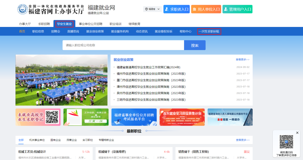 1.浏览器访问https://www.fj99.org.cn/,选择【毕业生就业】,点击【一次性求职补贴】。