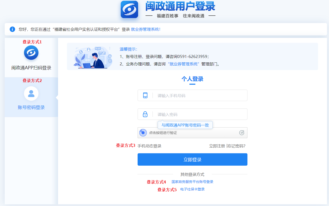 2.跳转到闽政通用户登录页面,可选择闽政通APP扫码登录、账号密码登录、手机动态码登录、国家政务服务平台账号登录和电子社保卡登录方式中任意一种,登入系统。