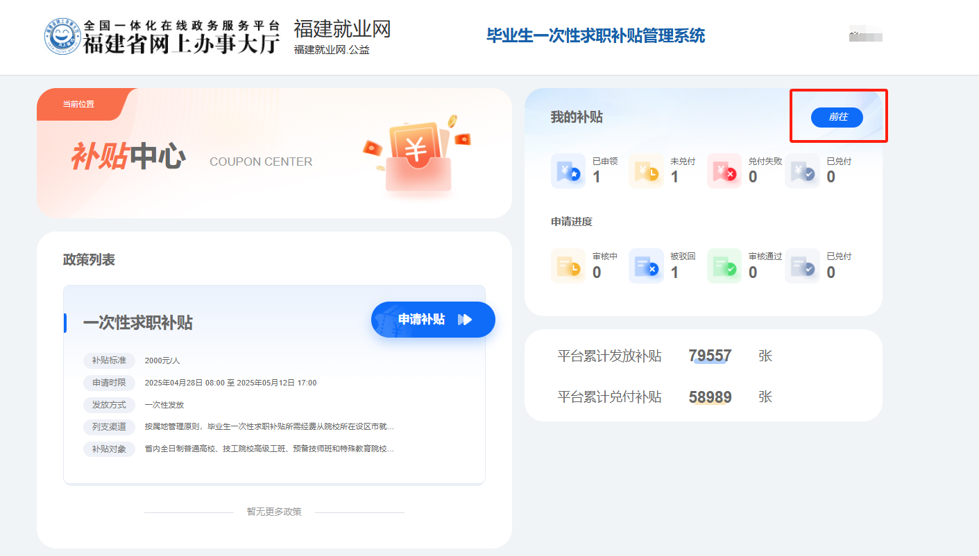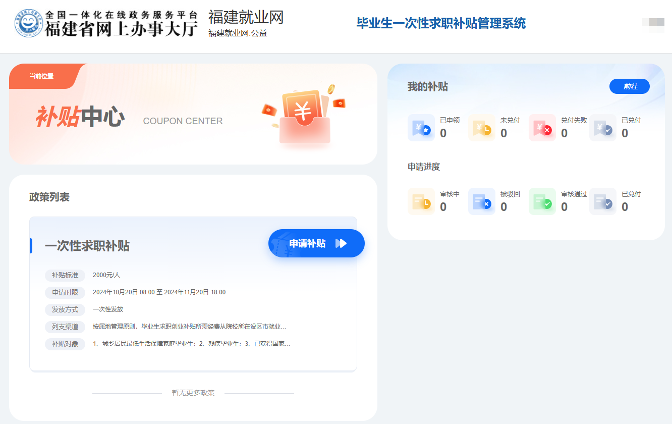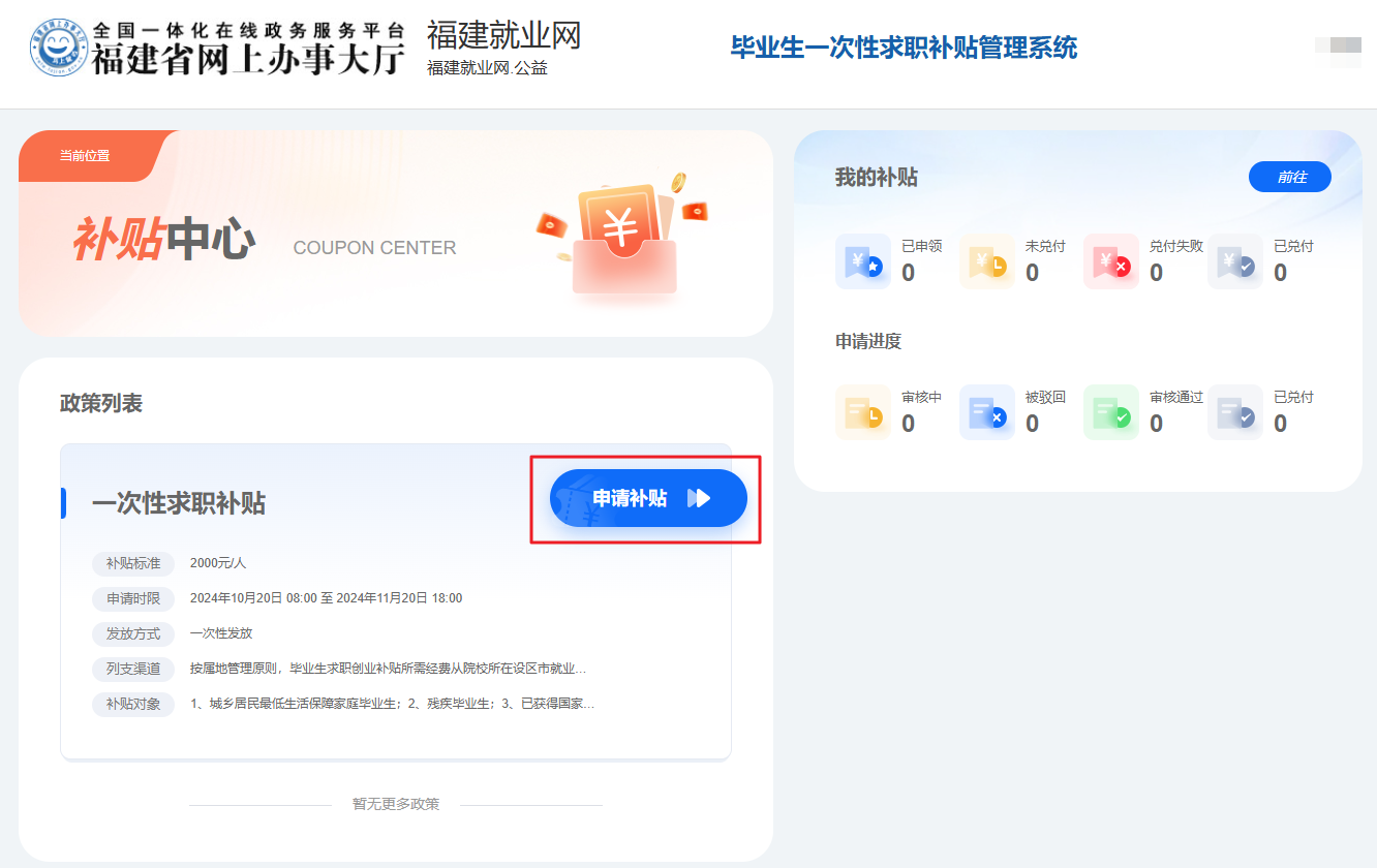 ①进入毕业生一次性求职补贴管理系统界面,申请前建议先查看求职补贴政策信息。
