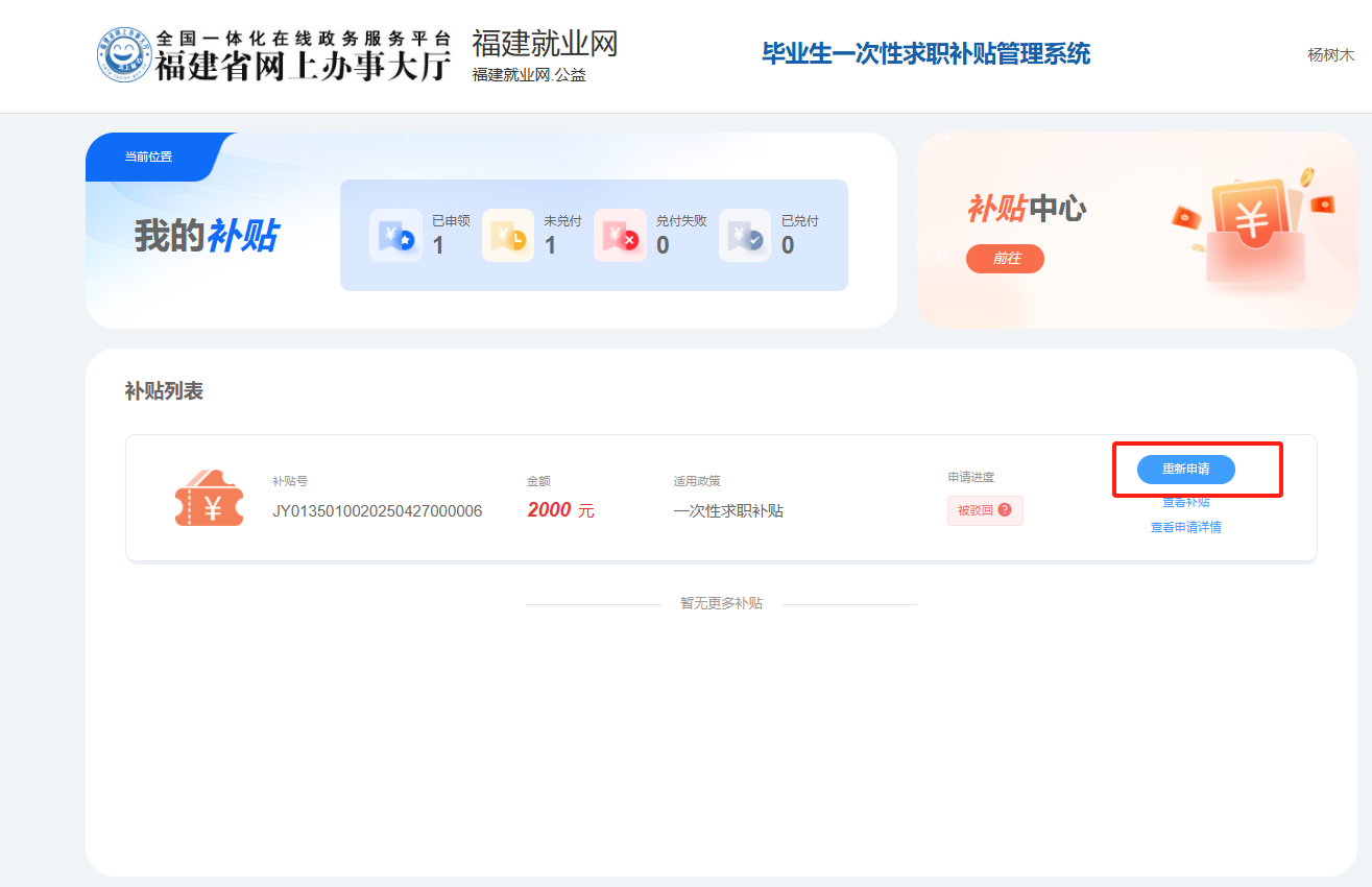 点击【我的补贴 】,进入个人中心,查看申请流程,点击【重新申请】。
