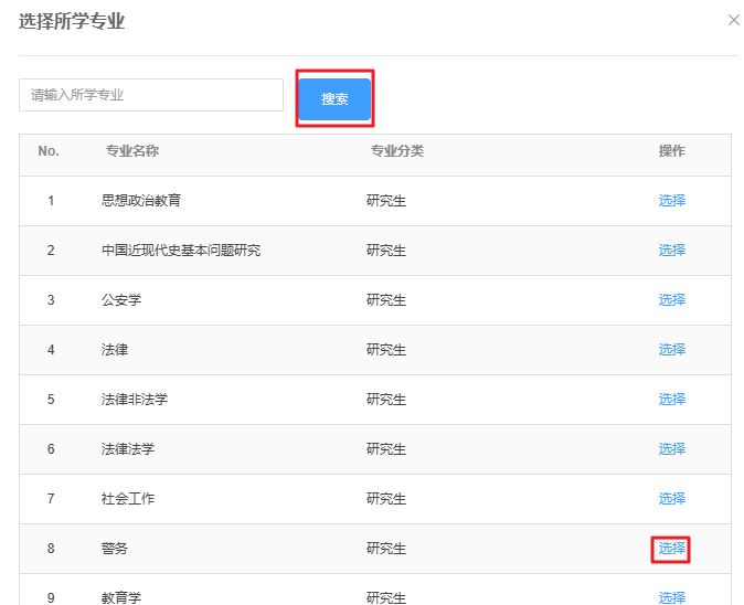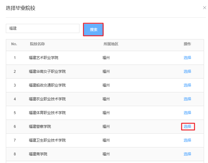 院校名称:在输入框中填写院校名称,点击【搜索】,然后在列表中点击【选择】,选择目标院校。