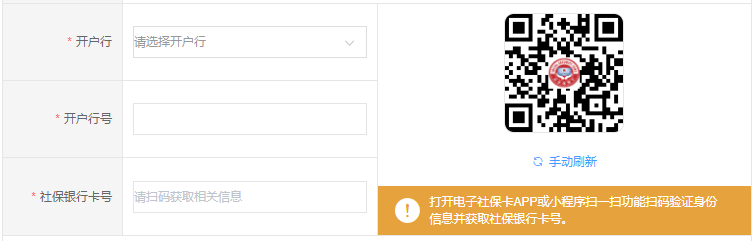 请先打开微信或支付宝搜索“电子社保卡”小程序扫码验证身份信息,或下载“电子社保卡”APP进行扫码验证,自动获取社保银行卡号(不可修改),再选择社保卡开户行。如扫码后无信息,可手工输入本人其他银行卡账号信息。