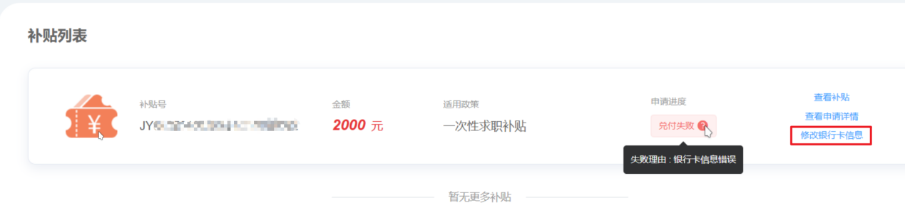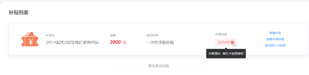 补贴兑付失败时,鼠标悬停申请进度后的【?】按钮可以查看具体失败原因:
