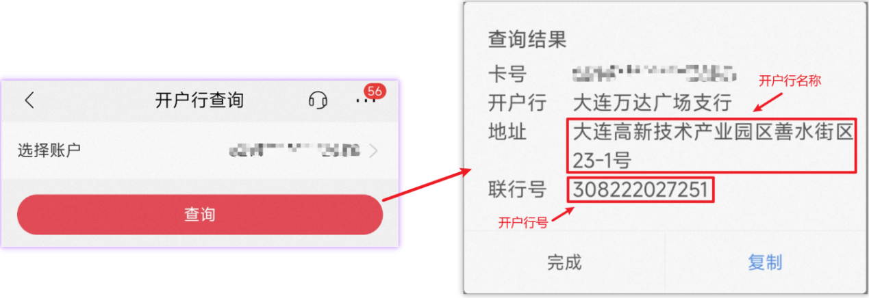 ④选择银行卡后点击【查询】按钮即可获取“开户行名称”及“开户行号”。