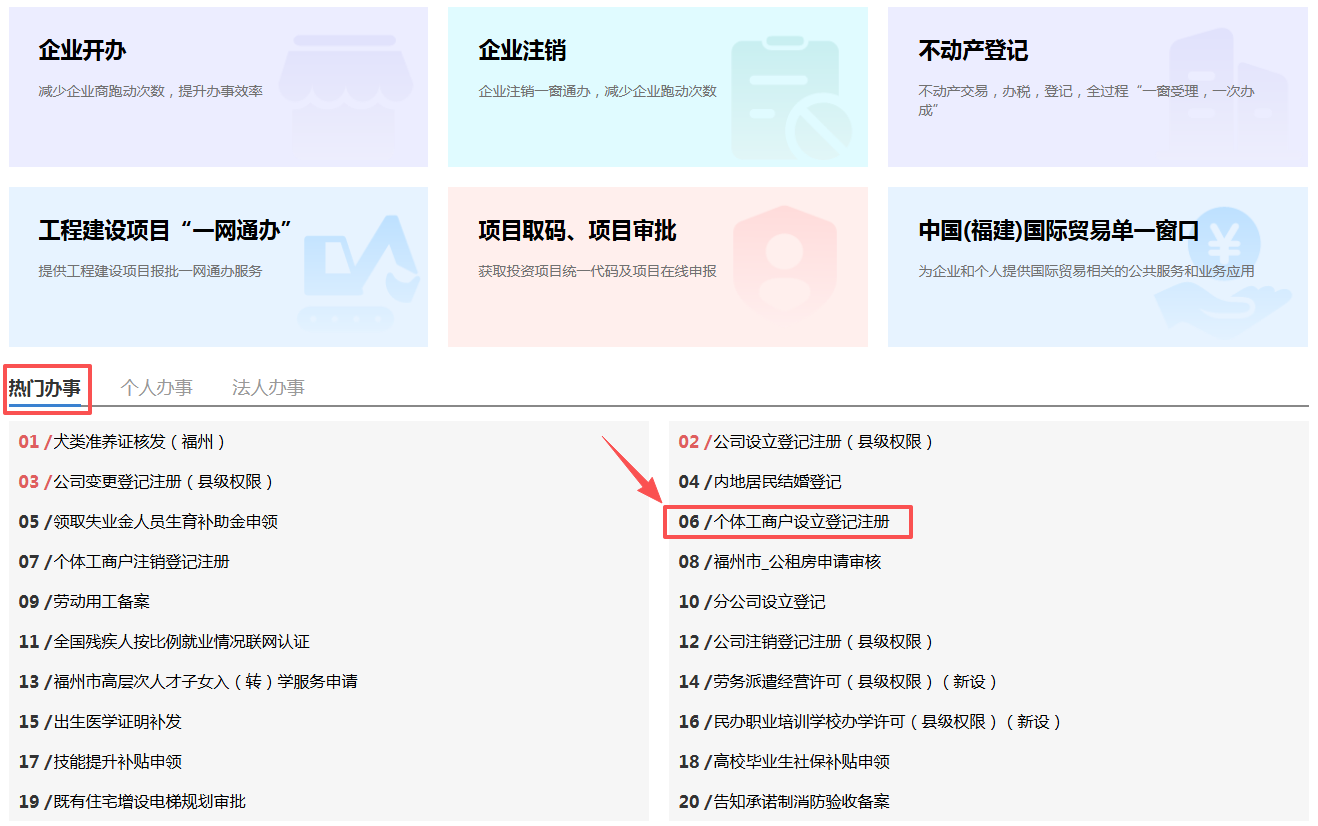 2.找到页面中的“热门办事”,点击“个体工商户设立登记注册”。