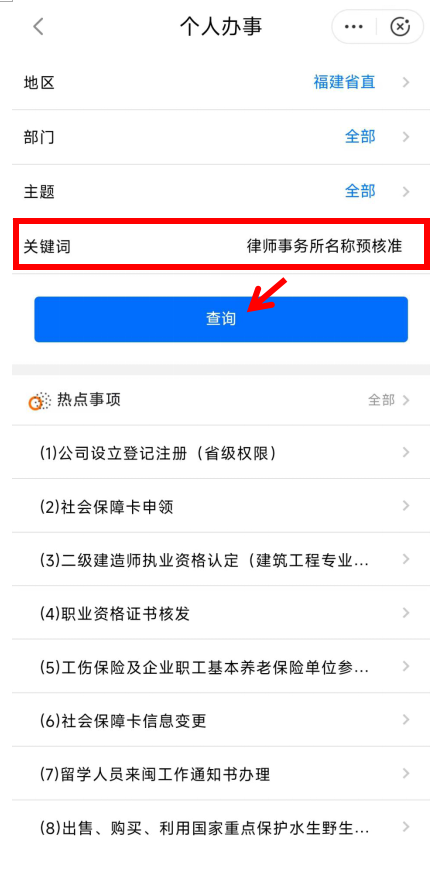 3.在“关键词”一栏中填写“律师事务所名称预核准”后,点击“查询”。