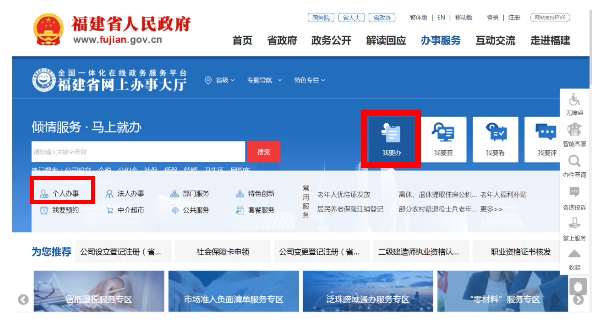 1.登录福建省网上办事大厅首页,点击“我要办”,在下拉框中选择“个人办事”。