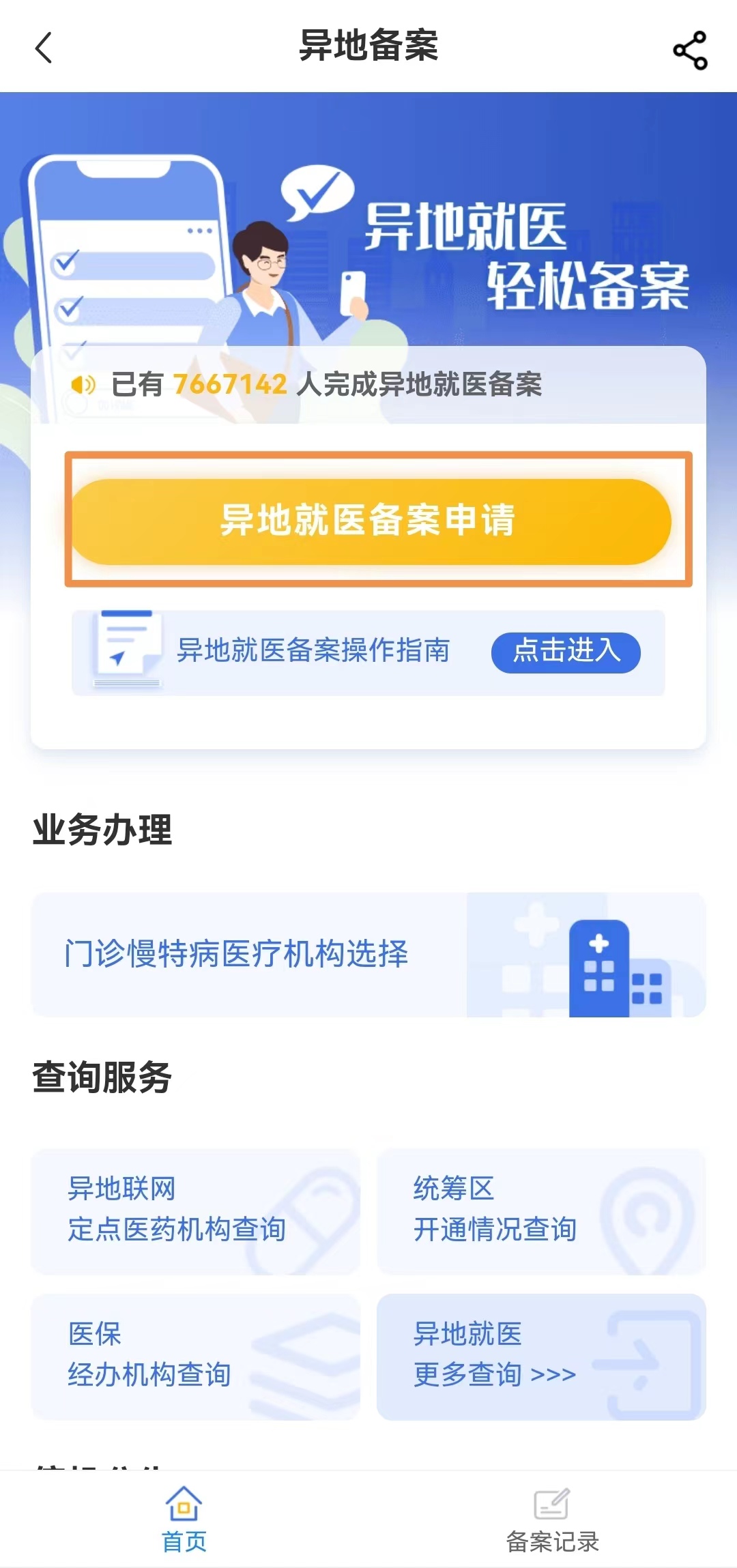 第一步,进入国家医保服务平台APP首页,点击【异地备案】。