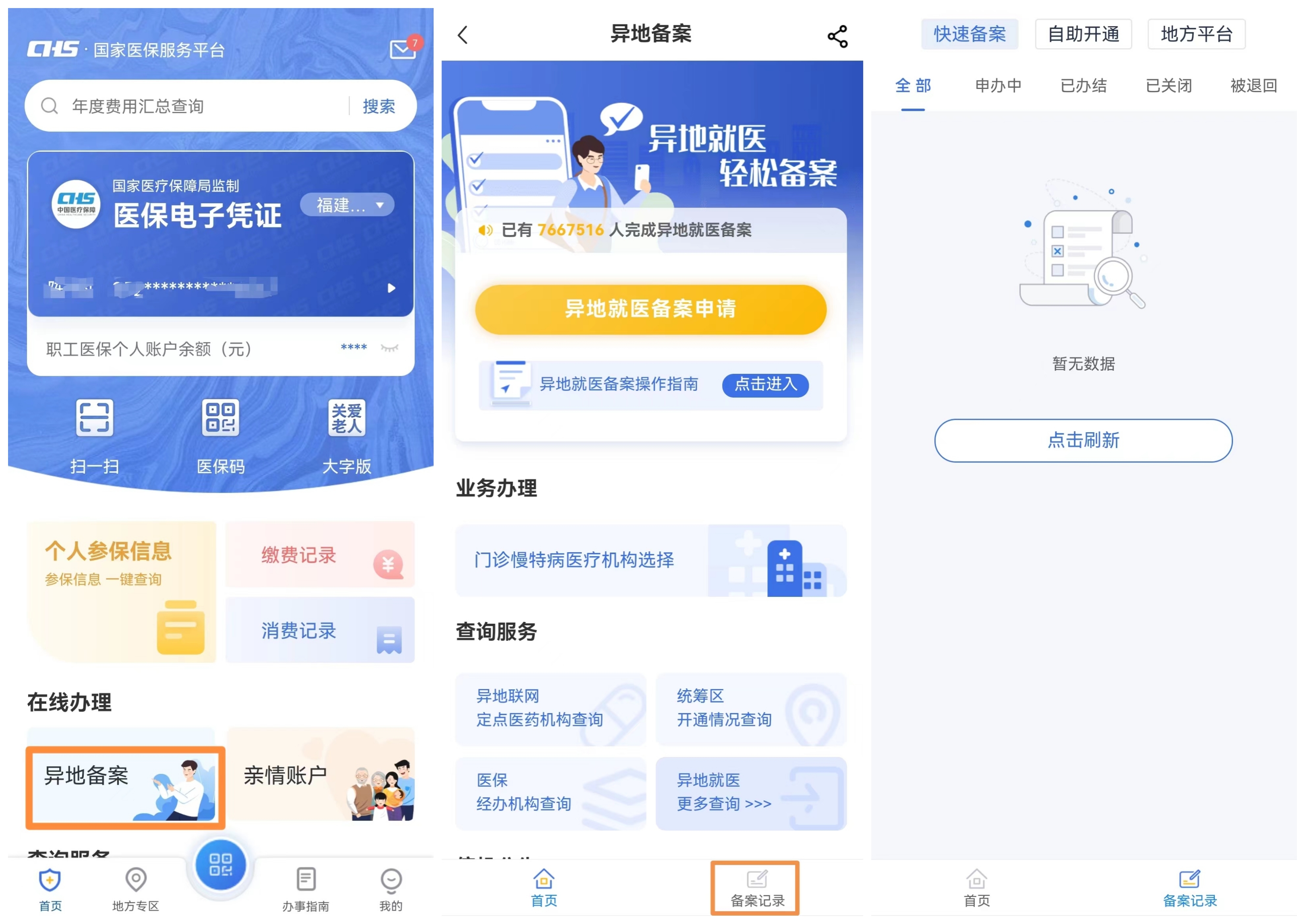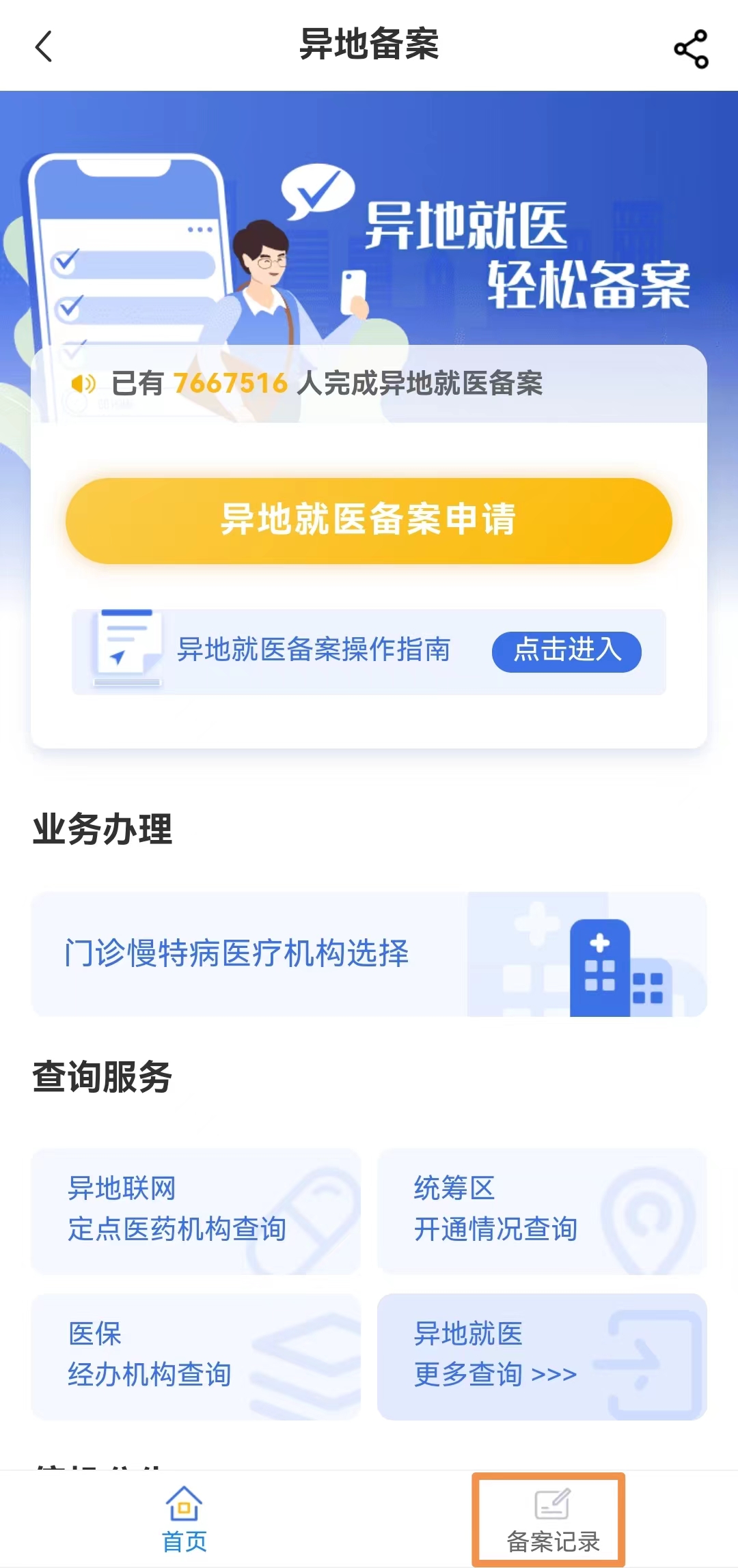 进入国家医保服务平台APP首页,点击【异地备案】,点击【备案记录】,随时查询办理进度。