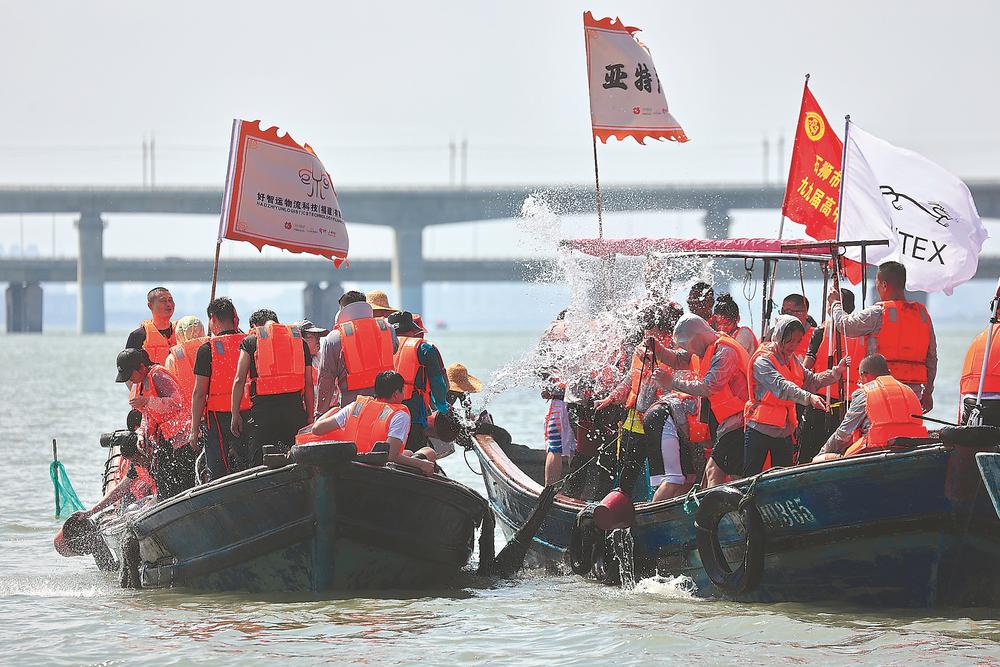 火热的阳光难阻两岸民众的热情,别开生面的“海上泼水”把文化节活动推向高潮。人们乘着渔船,手持脸盆、水桶盛水,泼向对方船上的人,互相嬉戏,以此驱邪消灾、祈求吉祥平安,祝愿海上航行安全。