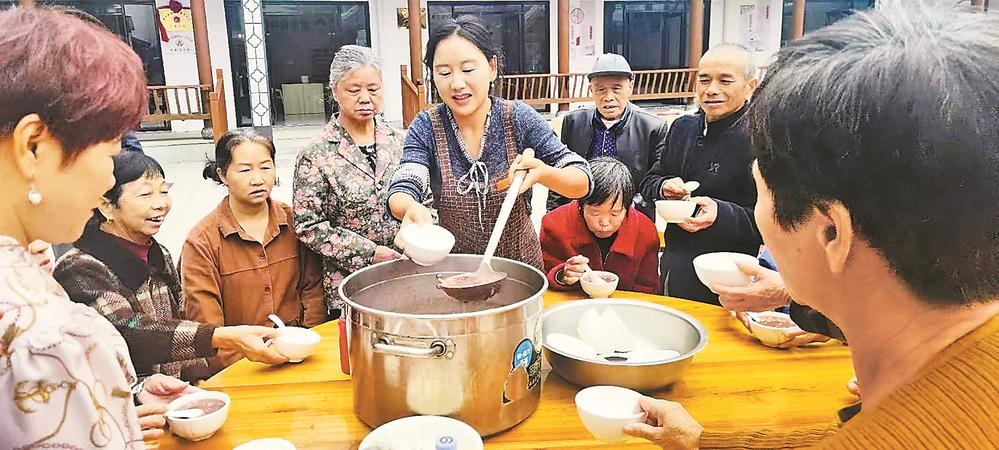 书坊乡“幸福里”社区的广场陈列着两张圆桌,围坐在桌旁的老人们愉快地交谈着。5名小学生在老师的指引下,配合着工作人员把八宝粥煮好,然后端到老人们面前。