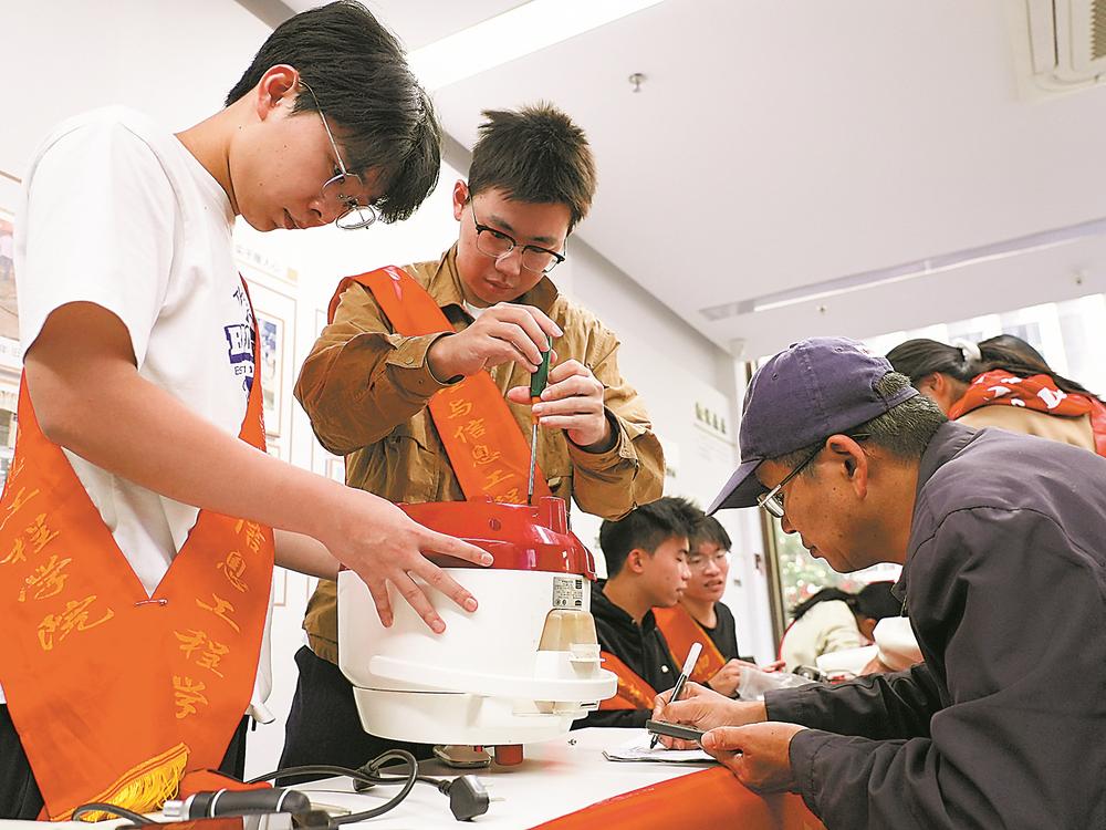 “应该是接触不良,小毛病!”话音刚落,几个大学生已围了上来——万用表一测、焊枪一点,几分钟后,电饭煲“嘀”的一声重启成功。