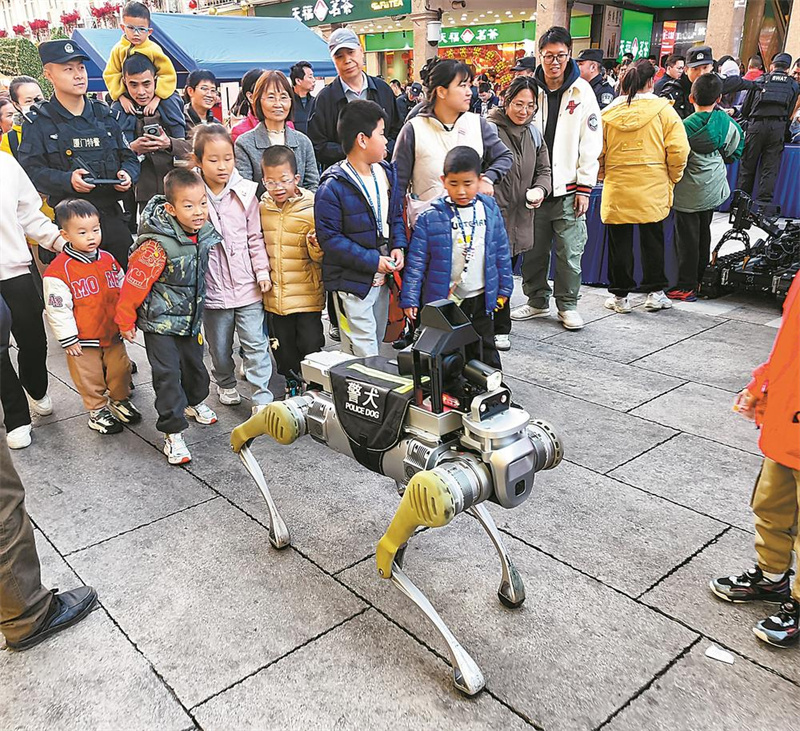 10日下午,厦门市公安局在厦门中山路步行街举办警营开放日活动。图为侦查机器狗与市民互动。记者 傅韬旭 摄