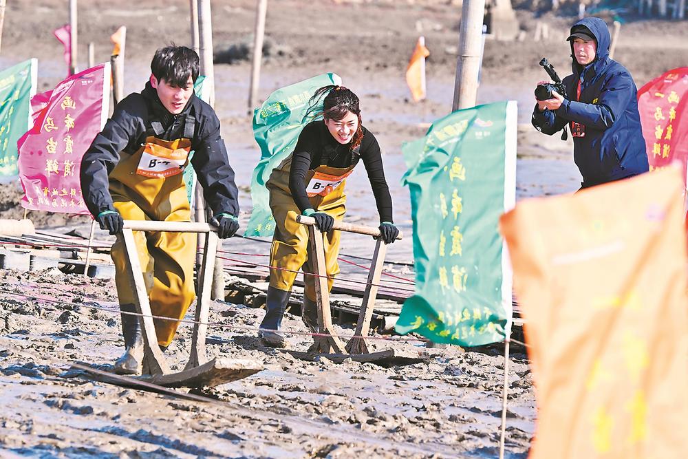 8日,一场滩涂“木泥马”挑战赛在福建省霞浦县冬瓜山赶海基地举行,选手们用传统赶海工具“木泥马”(又称“泥橇”)在滩涂上接力滑行、奋勇争先,以别样方式迎接马年春节。“木泥马”这一传统渔具如今变身地方特色文旅项目,成为游客赶海新玩法。同时,霞浦县宏昌工业文创基地内的跑马场和马文化美术展也随春节临近热度攀升,吸引游客参观、体验。(新华社)
