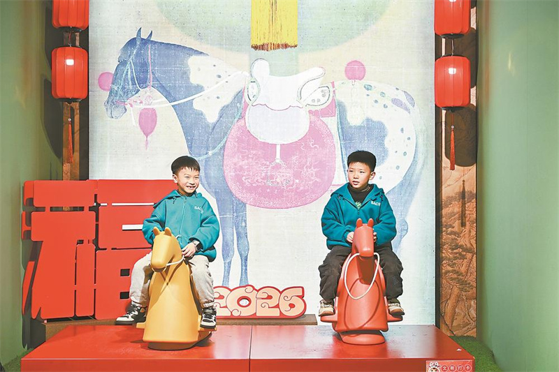 2月4日至5月5日,马舞新春——丙午马年全球生肖文化大联展在福建博物院展出,汇集数百幅以马文化为题材的文物与艺术品图片,和院藏80余件与马相关的主题文物同期展出。图为2月11日,小游客在展览门口的打卡处拍照。记者 施辰静 摄