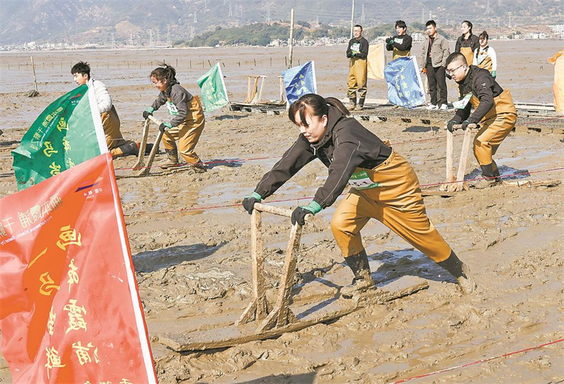 2月8日,一场滩涂“木泥马”挑战赛在霞浦县冬瓜山赶海基地举行,选手们用传统赶海工具“木泥马”(又称“泥橇”)在滩涂上接力滑行、奋勇争先,以别样方式迎接马年春节。“木泥马”这一传统渔具如今变身地方特色文旅项目,成为游客赶海新玩法。姜克红 摄