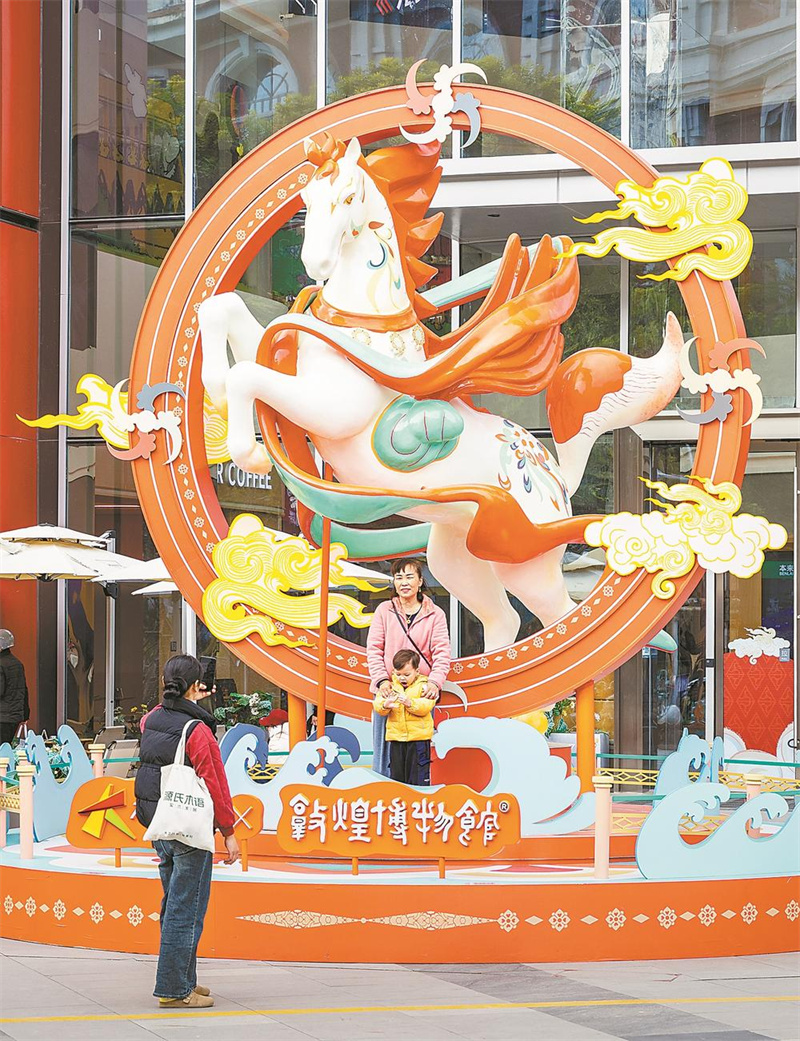 2月8日,游客在4米高的巨型“敦煌翼马”艺术装置前拍照留念。节日期间,敦煌博物馆“天马献瑞”华南首展落地厦门大悦城。林旭东 摄