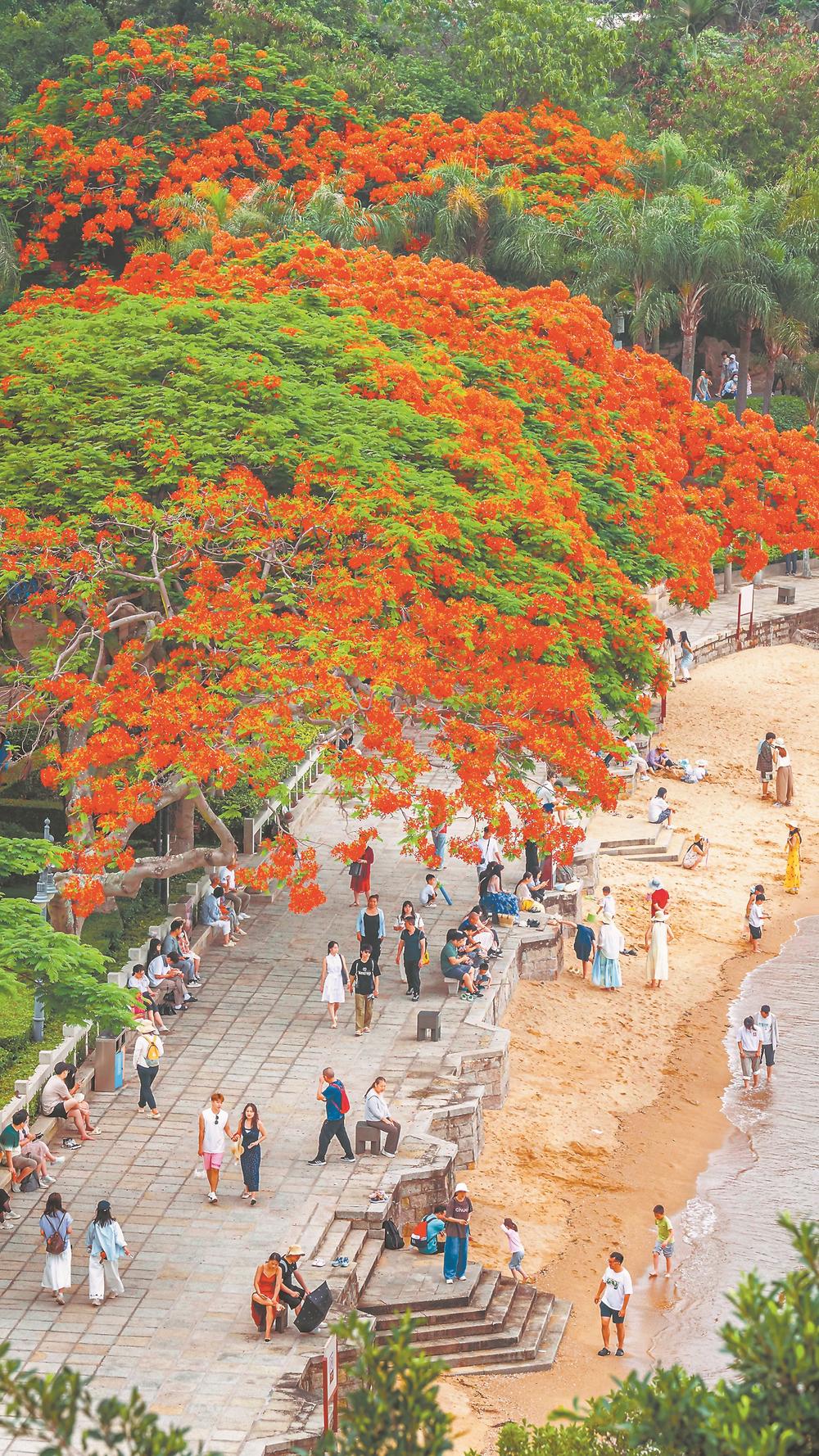 图为厦门鼓浪屿,市民游客在凤凰花下游玩。(通讯员 陈瑞坤 摄影报道)