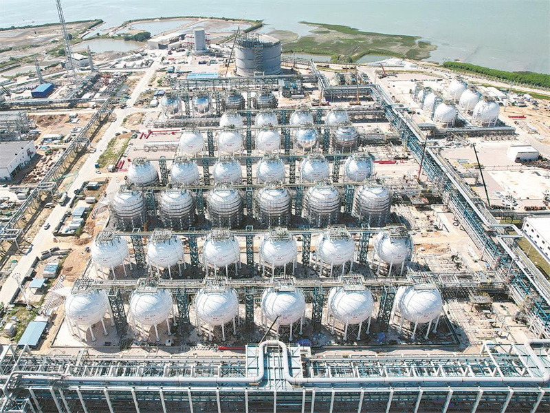 总投资448亿元的中沙古雷乙烯项目已全面由土建阶段转入设备安装高峰期,国庆中秋假期,1.1万余名建设者以“满弓紧弦”之势,全速推进聚乙烯、聚丙烯等关键装置群的建设安装。图为中沙古雷乙烯项目的球罐群航拍图。(记者 苏益纯 通讯员 詹照宇 摄)