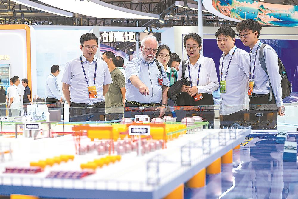福建海上风电装备专题展的工作人员正在为外国嘉宾介绍微缩模型。(陈天博 摄)