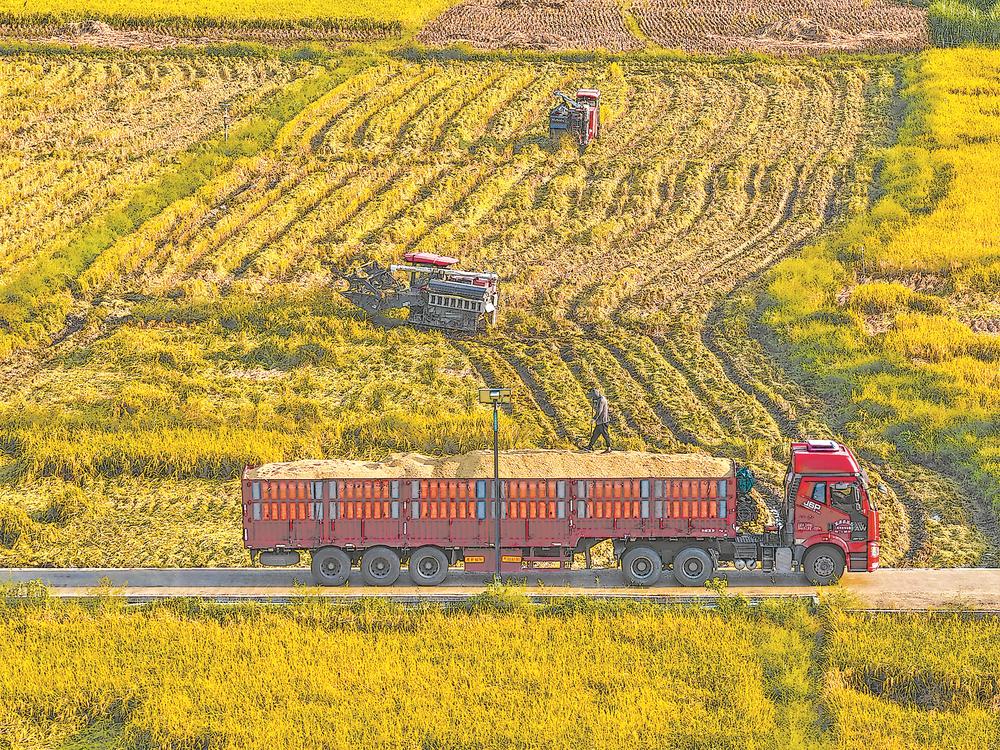 福安市10万多亩中稻陆续开镰。16日,溪潭镇廉村农机手驾机收割水稻。(记者 单志强 通讯员 李郁 陈雅芳 摄)