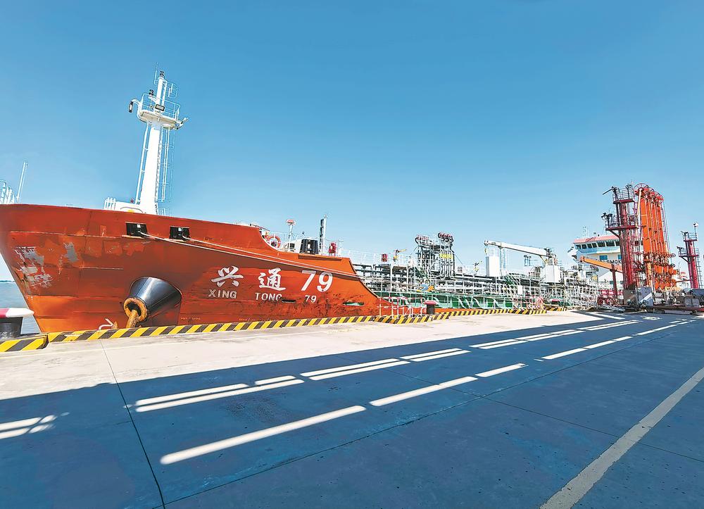 近日,“兴通79”轮成功靠泊湄洲湾港斗尾港区外走马埭作业区19号泊位,进行装货作业后,装载7500吨乙二醇驶向江苏太仓。这是外走马埭作业区迎来的首艘5000吨级以上化工品船舶。(记者 林剑波 通讯员 蚁智腾 方超凡 摄)