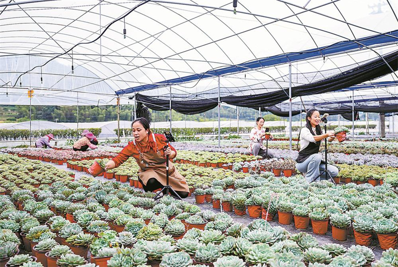 近日,宁化县安乐多肉种植基地迎来销售旺季。主播抢抓“双11”到来的黄金周期,在大棚内热情地向直播间顾客展示、推销各种多肉植物,一旁的村民快速有序地将售出的盆栽分类打包。