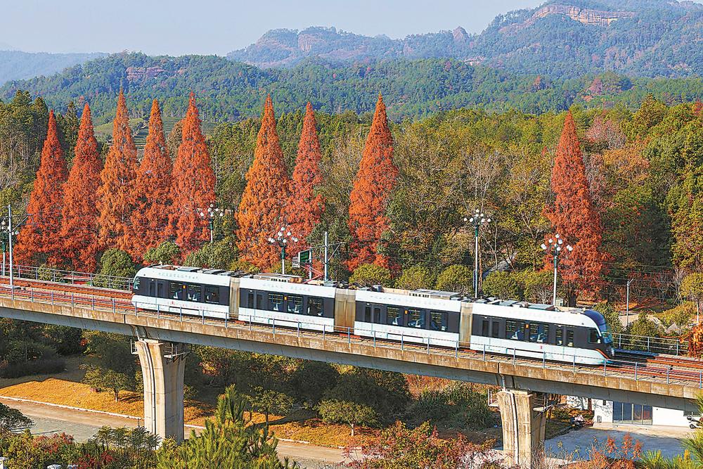 冬季的武夷山国家公园,层林已然被晕染成斑斓的调色盘,一辆淡绿色的有轨电车,正循着轨道缓缓穿行在这幅天然画卷里。它像是从冬韵里游出来的精灵,车轮与轨道轻触的声响,细碎得如同山风拂过竹叶的呢喃。车窗外,漫山遍野的冬季景色次第铺展,时而掠过缀满野果的灌木丛与红叶;车厢里的人,或倚窗远眺,或举着相机定格眼前的盛景,连呼吸都不自觉放轻,生怕惊扰了这方冬日的静谧。(通讯员 邱汝泉 摄影报道)