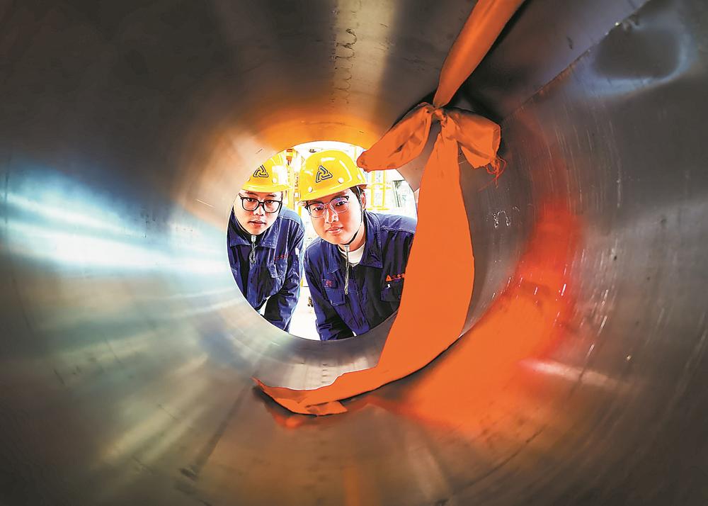 工人查看生产出的第一卷冷轧硅钢。