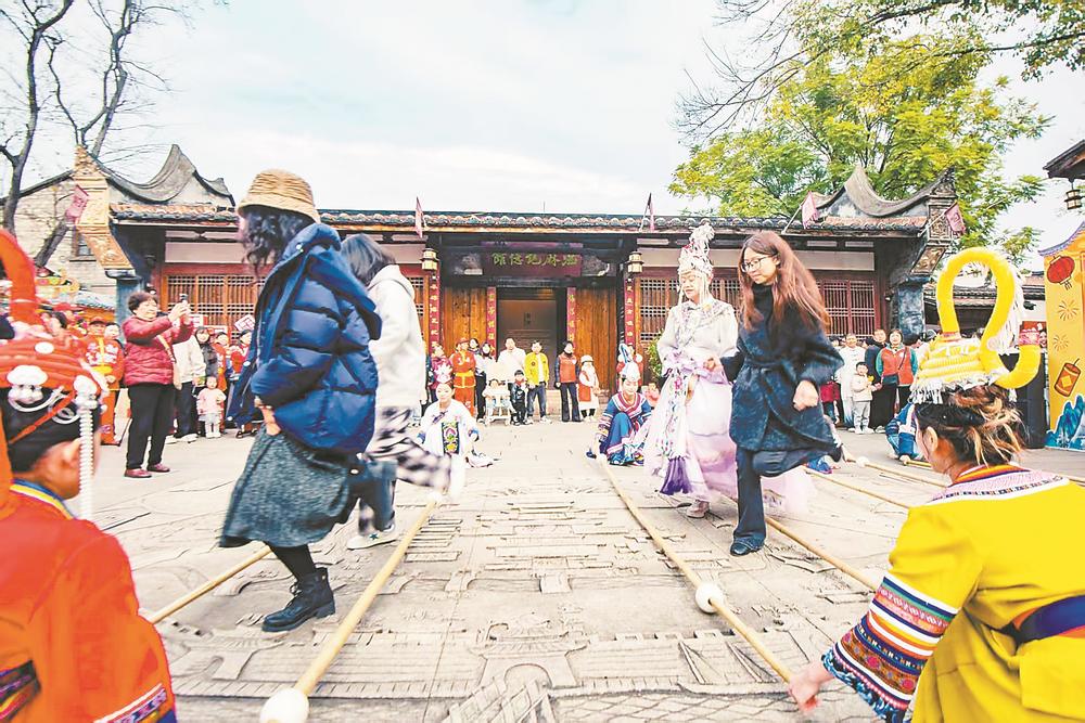 昨日,“凤展非遗韵 厝迎幸福‘连’”连江县非遗嘉年华暨迎新年活动举行。图为游客体验畲族竹竿舞。(记者 陈欢欢 通讯员 杨柳州 摄)