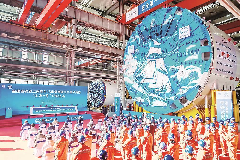 福莆宁F2、F3线长乐机场段项目位于福州新区国际航空城,由长乐北隧道及长乐南隧道组成。此次承担南隧道掘进任务的盾构机整机长135米、重3500吨,是当前我省铁路工程领域首台13米级智能化泥水平衡盾构机。(记者 张文奎 通讯员 林焰明 摄)