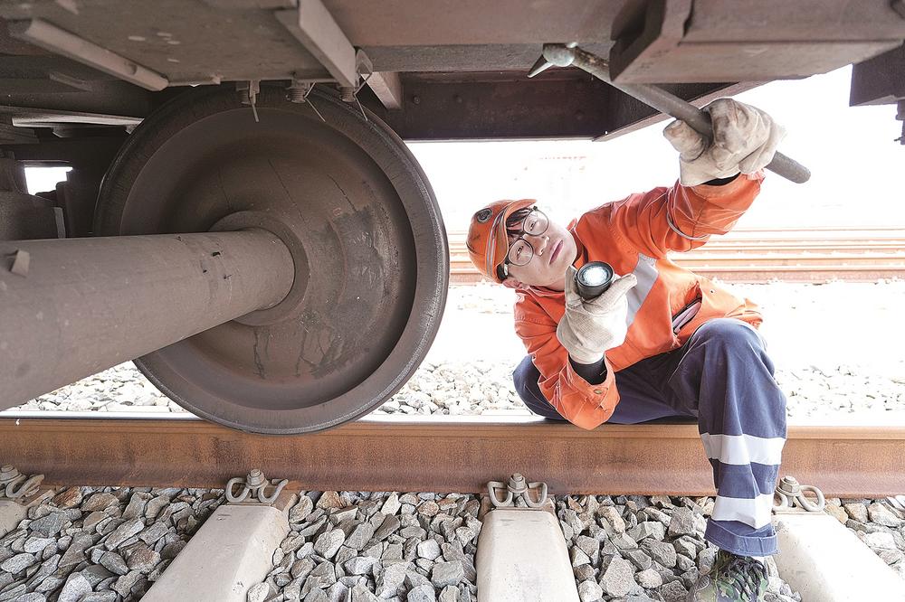春运在即,铁路部门加强车辆检修维护,全力保障铁路货物列车安全运行。图为1月24日,中国铁路南昌局集团有限公司福州东车辆段检车员在认真检查铁路货车。(通讯员 向帅 谷堂林 摄影报道)