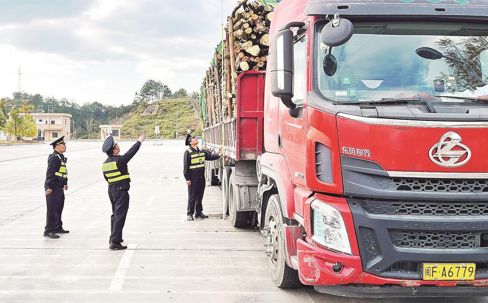 春节临近,高速公路车流量增大。为确保春运期间道路安全畅通,1月28日,一场横跨龙岩、漳州两地的联合执法专项行动在漳武高速永定大溪服务区启动。图为执法人员对大货车是否超载进行现场测量。(通讯员 熊川 陈景彬 李栋 摄影报道)