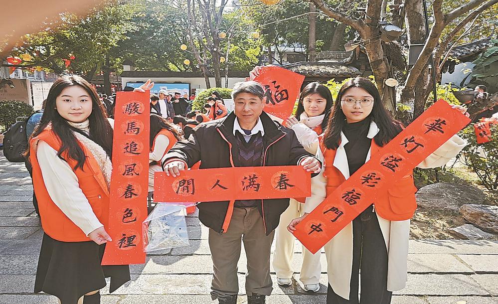 连日来,我省高校学子走进城乡,开展系列探寻春节文化内涵与时代价值的寒假社会实践活动。图为近日,福州外语外贸学院学生在三坊七巷开展写“福”字送春联活动。(记者 余跃 通讯员 雷清文 摄
