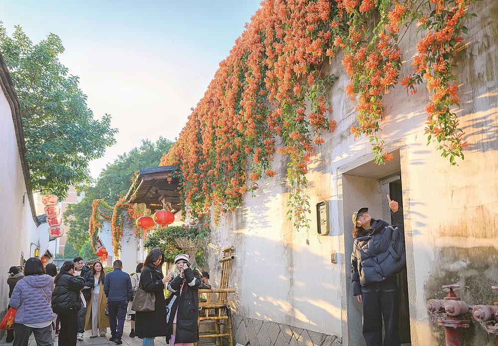 图为2月8日,福州三坊七巷,橙红色的炮仗花如瀑布般从灰瓦白墙上倾泻。(记者 施辰静 摄影报道)