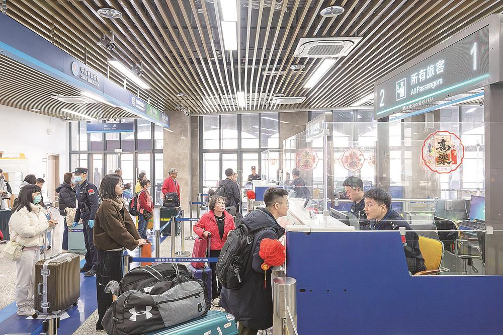 2月14日,福州边检站民警在为台胞办理手续。他们还组建了“乡音伴行小分队”,用闽南语、福州话与台胞亲切交流,让通关体验更具温情。(记者 王毅 摄)