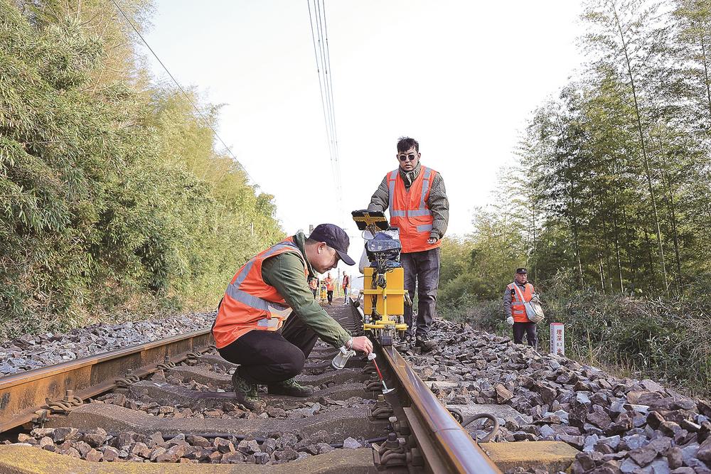 近日,中国铁路南昌局集团有限公司南平工务段的探伤工们坚守在峰福铁路线上,对钢轨及焊缝进行细致检测,确保列车运行安全。这些橙色身影在寒风中步行数公里,日均行走超2万步,用责任与专业守护着万千旅客的归途安全,被称为钢轨的“守护神”和“B超师”。图为探伤工在钢轨伤损处打上标记。(记者 张颖 通讯员 吴志祥 摄)