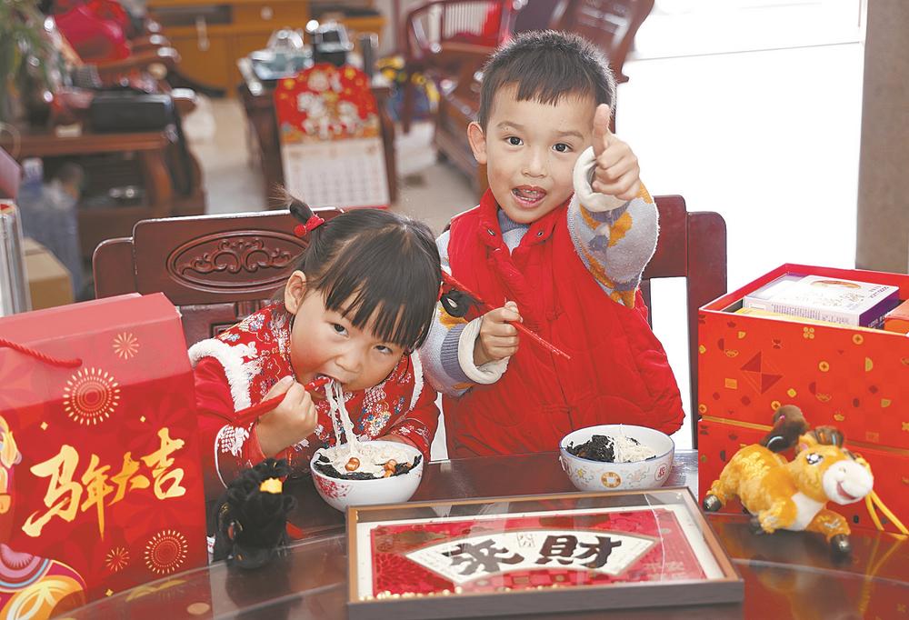 正月初一早上吃平安面,是莆田、福州、闽南等地的传统习俗,寓意长长久久、平平安安。图为马年正月初一一早,莆田小朋友在吃平安面。(林鸿达 摄)