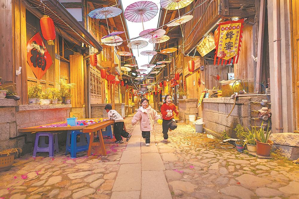 2月20日,宁德市蕉城区洋中镇东山古街,几名孩童在拥有千年历史的古街巷中尽情奔跑嬉戏。(丁天霖 摄)